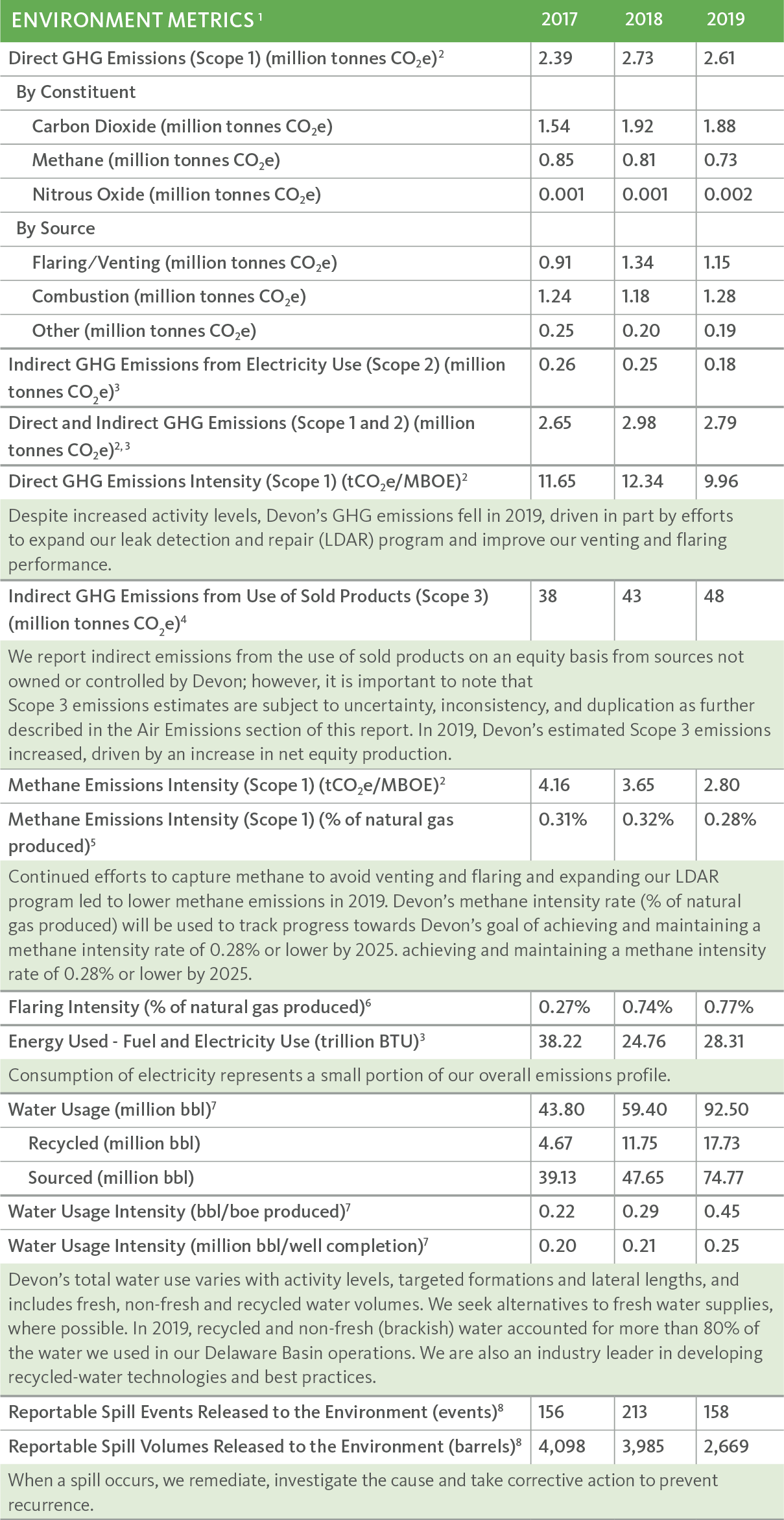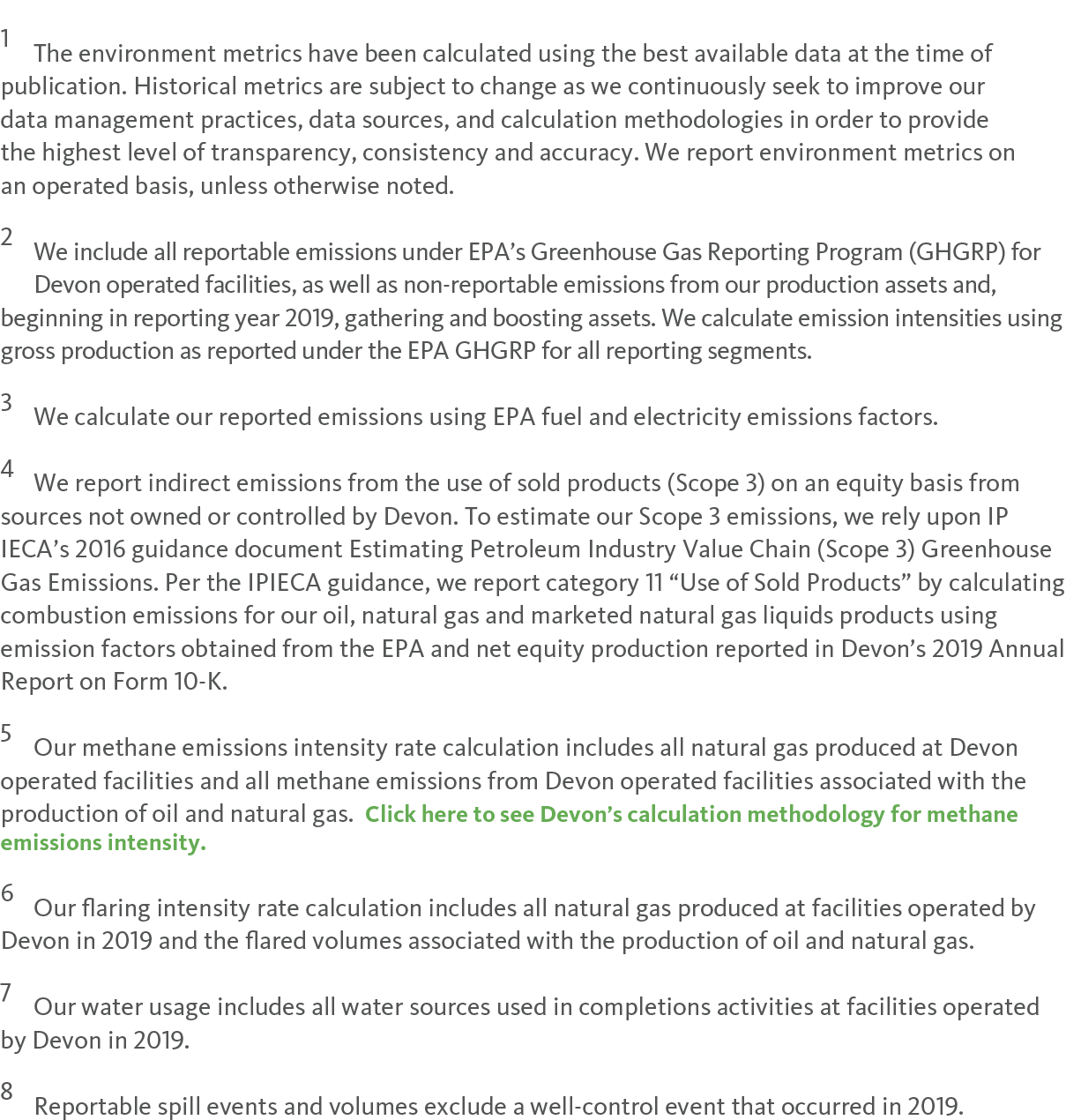 Devon tracks specific metrics for greenhouse gas (GHG) and methane emissions, flaring, spills, energy use and water use and disposal. We share this information in this report and other public disclosures because we embrace the accountability and we’re proud of our efforts and results. For additional metrics and details on our practices, please refer to our 2020 CDP Climate and CDP Water Responses.