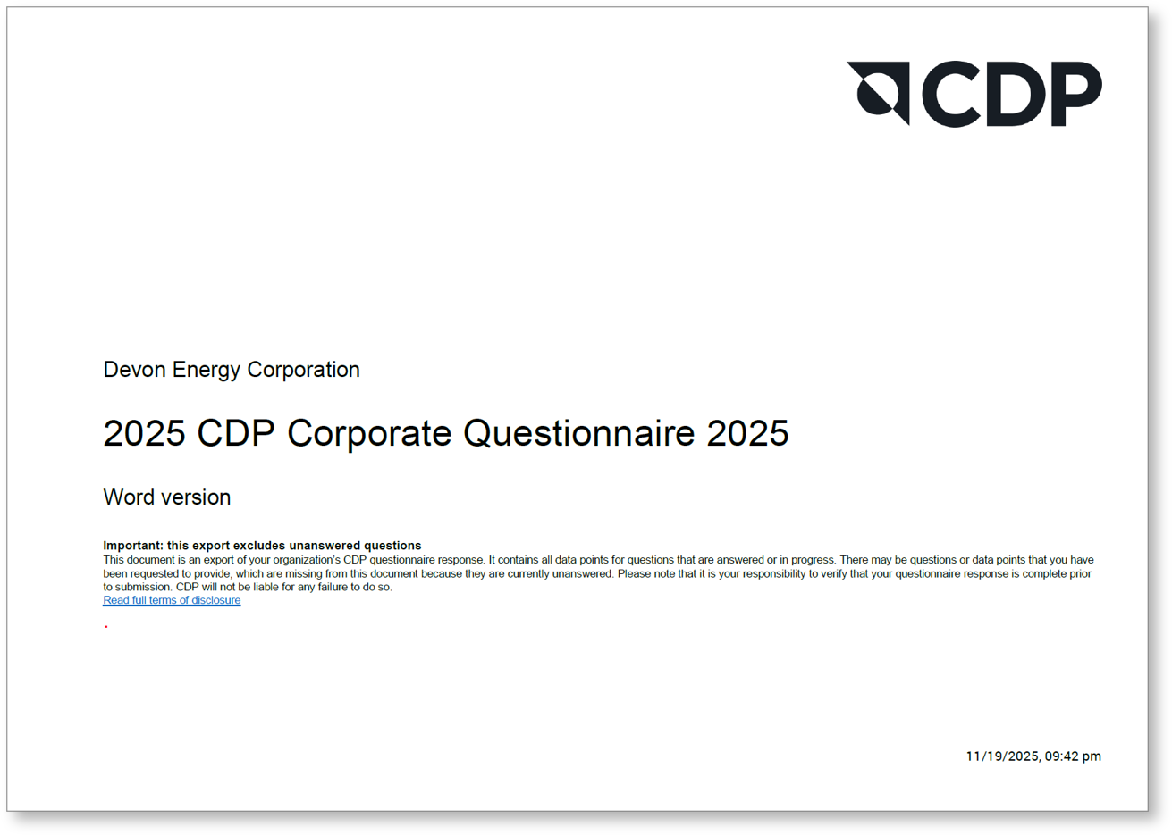 Devon will continue to produce the oil and gas the world needs in a safe, environmentally responsible and ethical way, and disclose our results publicly. Earning our stakeholders’ trust is important for the future of our business, so we’ll continue to plan for the risks and opportunities ahead.